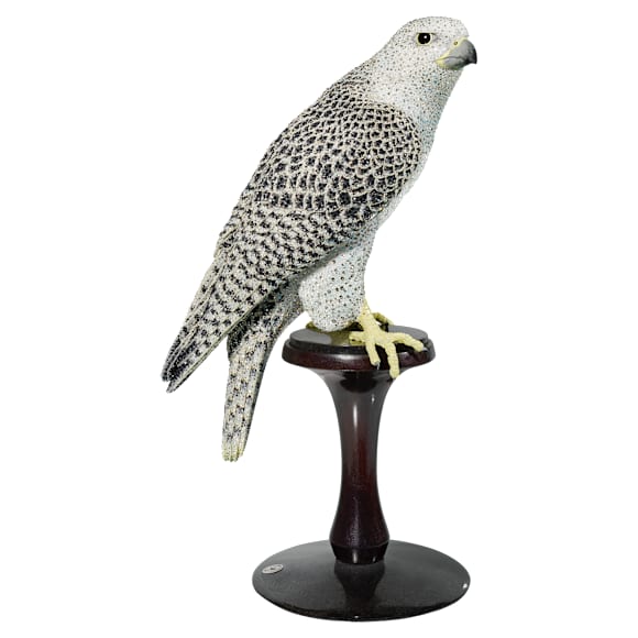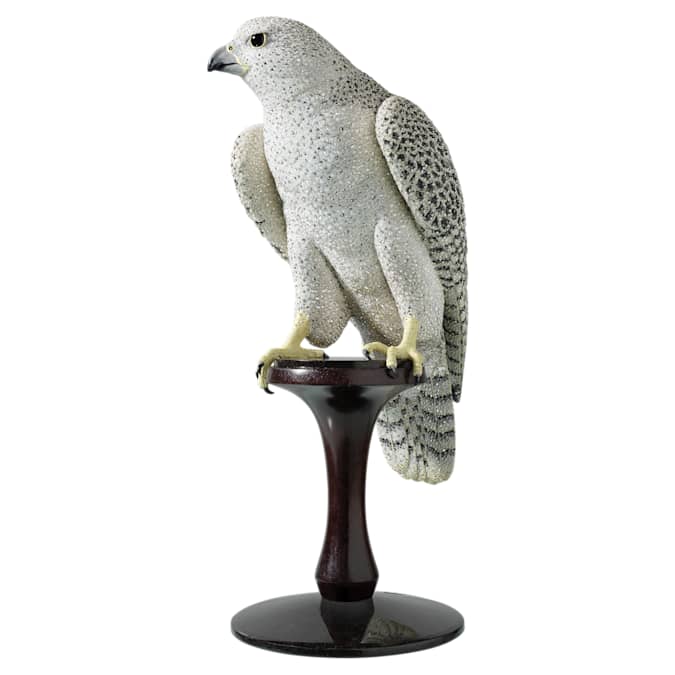 Limited to 300 numbered editions, this breathtaking new masterpiece from our Crystal Myriad collection features a magnificent Gyrfalcon. A symbol of power, freedom, and determination, the majestic bird stands attentively on a granite and wood base, displaying its natural grace and stunning plumage to bedazzling effect. Decorated by hand, Kedari features over 24’000 crystals in six different colors, set in Swarovski’s exclusive Pointiage® technique for maximum brilliance. Each piece takes 204 hours to complete and comes with a certificate of authenticity. The shipping procedure includes insurance and a delivery notice. Decoration object. Not a toy. Not suitable for children under 15.