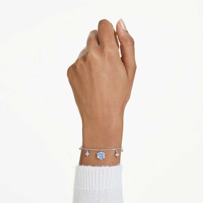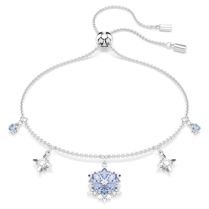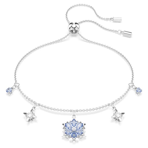 This bracelet beautifully captures the Swarovski snowflake in brilliantly faceted style. The rhodium plated design is embellished with blue Swarovski Zirconia, which forms five wintry motifs on a delicate chain with an adjustable sliding closure. A beautiful addition to your jewelry collection or the perfect gift.
