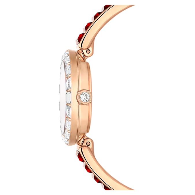 Elegance is amplified with crystals in this beautiful jewelry-inspired timepiece. The 25-mm stainless steel design has a rose gold-tone finish and is encircled by a bezel with 20 baguette-cut clear crystals, while a single crystal is set within the crown. Baguette-cut crystals highlight three index markers on the red dial, which also features a swan logo at 12 o’clock. Around the wrist, the bangle-style bracelet is adorned with 16 baguette-cut red crystals and is fully adjustable for a comfortable fit. The Swiss made watch is water resistant to 50 m and is the ideal accessory for a special occasion.