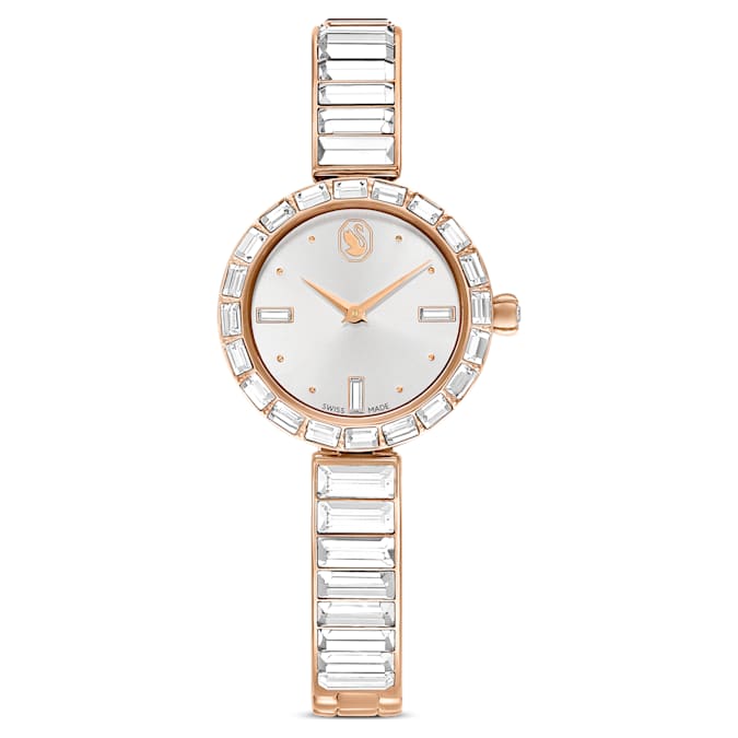 Elegance is amplified with crystals in this beautiful jewelry-inspired timepiece. The 25mm stainless steel design has a rose gold-tone finish and is encircled by a bezel with 20 baguette-cut clear crystals, while a single crystal is set within the crown. Baguette-cut crystals also highlight three index markers on the light gray dial, which also features a swan logo at 12 o’clock. Around the wrist, the bangle-style bracelet is adorned with 16 baguette-cut crystals and is fully adjustable for a comfortable fit. The Swiss made watch is water resistant to 50 meters and is the ideal accessory to illuminate every facet of life.