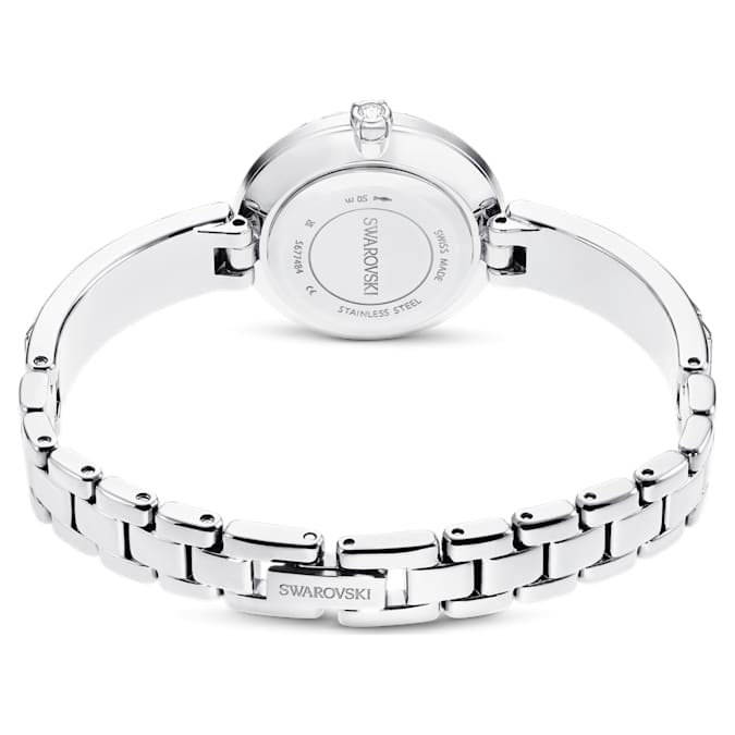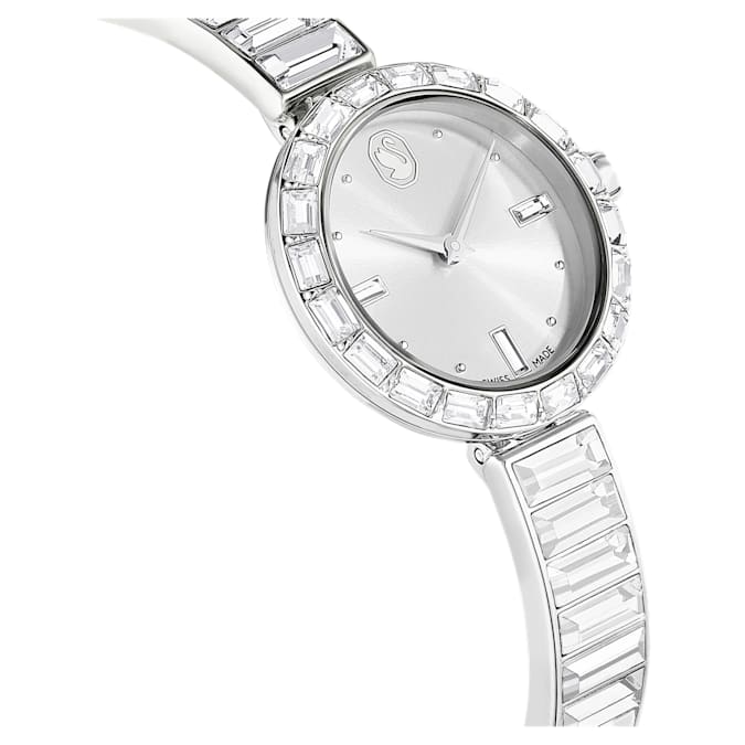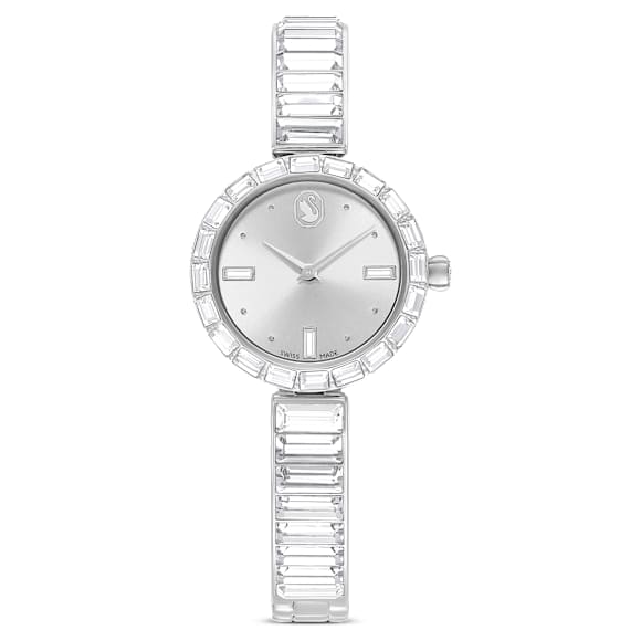 Elegance is amplified with crystals in this beautiful jewelry-inspired timepiece. The 25mm stainless steel design is encircled by a bezel with 20 baguette-cut clear crystals, while a single crystal is set within the crown. Baguette-cut crystals also highlight three index markers on the silver-tone dial, which also features a swan logo at 12 o’clock. Around the wrist, the bangle-style bracelet is adorned with 16 baguette-cut crystals and is fully adjustable for a comfortable fit. The Swiss made watch is water resistant to 50 meters and is the ideal accessory to illuminate every facet of life.