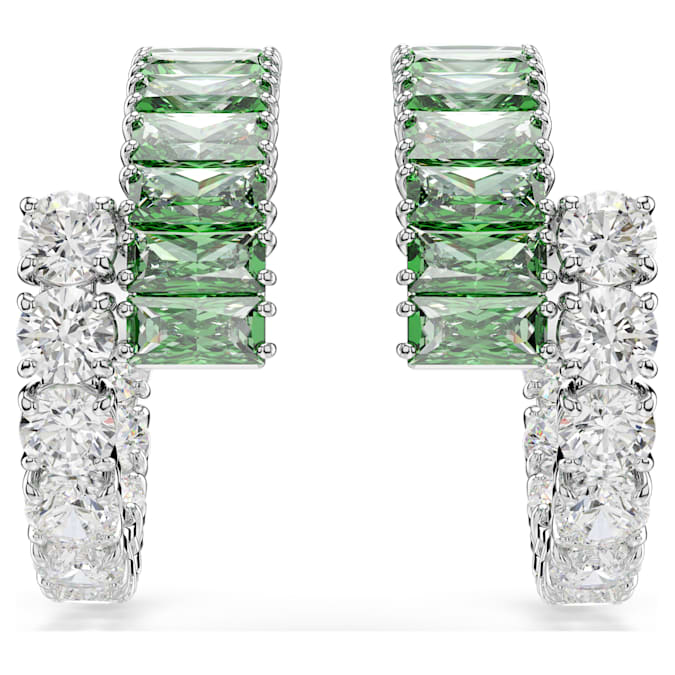These luxurious Matrix earrings were crafted for a vivid glow. Each small hoop is rhodium plated and features an overlapping design set with clear and green Swarovski Zirconia in round and baguette cuts. A joyful choice for day-to-night styling, these earrings can be paired with a matching ring or bangle to accentuate the color in your style.