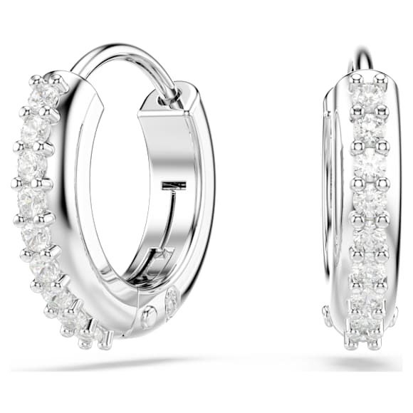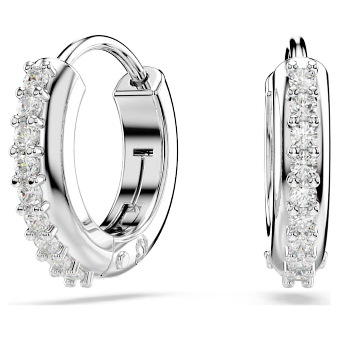 Ignite your style with these shimmering mini hoops. The pierced earrings are rhodium plated and adorned with clear prong-set Swarovski Zirconia on the outer section. An easy way to illuminate any outfit.