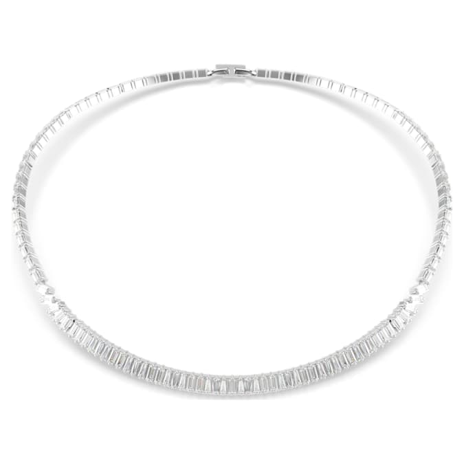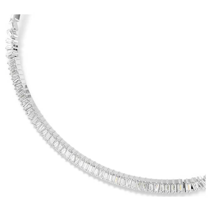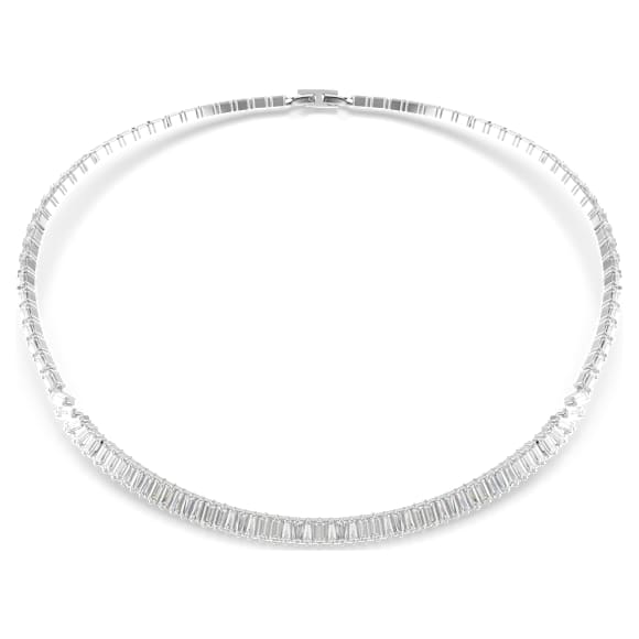 This scintillating Matrix necklace was made for timeless beauty. Fitted with a foldover clasp and adjustable extender, the all-around design is rhodium plated and fully adorned with baguette-cut Swarovski Zirconia, each placed in a prong setting. The look is radiant and luxurious. Heighten the impact by wearing this necklace with a matching pair of Matrix hoop earrings.
