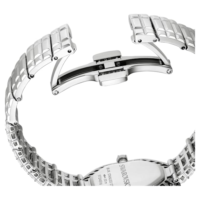 This innovative timepiece is a one-of-a-kind creation that combines signature design with mastery of light. Crafted with genuine savoir-faire, the watch is inspired by the Matrix jewelry family and features a 13 x 18 mmcase in stainless steel. The bezel is presented in the House’s signature octagon shape and is set with a stunning mix of 78 round and fancy cut crystals and Swarovski Zirconia. This provides a radiant frame for the minimalist sunray dial, which elegantly displays three crystal hour markers and a swan logo. A single crystal is also placed within the crown, while around the wrist, the luxury is heightened further by a radiant bracelet set with 72 Swarovski Zirconia. This watch is water-resistant to 50m and symbolizes Swarovski’s modern luxury at its very finest.