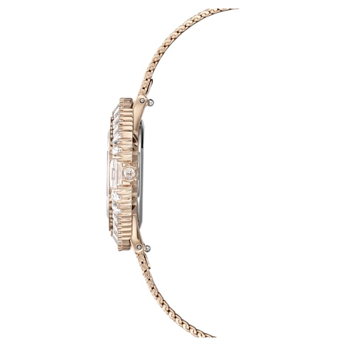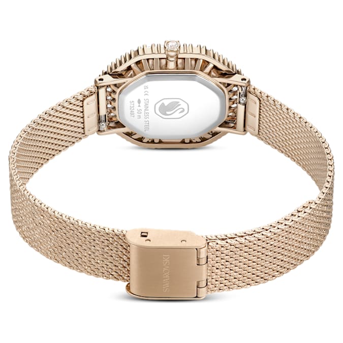 This innovative timepiece is a one-of-a-kind creation that combines signature design with mastery of light. Crafted with genuine savoir-faire, the watch is inspired by the Matrix jewelry family and features a 13 x 18 mmstainless steel case with a champagne gold-tone finish. The bezel is presented in the House’s signature octagon shape and is set with a stunning mix of 78 round and fancy cut crystals and Swarovski Zirconia. This provides a radiant frame for the minimalist sunray dial, which elegantly displays three crystal hour markers and a swan logo. A single crystal is also placed within the crown, while around the wrist, the luxury is heightened further by an adjustable mesh bracelet. This watch is water-resistant to 50m and symbolizes Swarovski’s modern luxury at its finest.