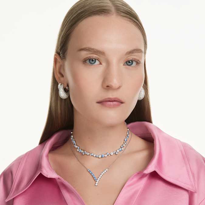 This bright pendant is elegantly brought to life by a v-shape silhouette in rhodium plating. The sleek design features clear and blue Swarovski Zirconia, presented in a vivid mix of round and baguette cuts. Suspended from a delicate chain, this modern jewelry matches perfectly with similar Matrix pieces to bring energy and radiance into any outfit.
