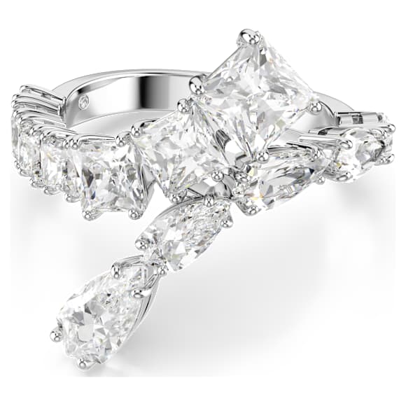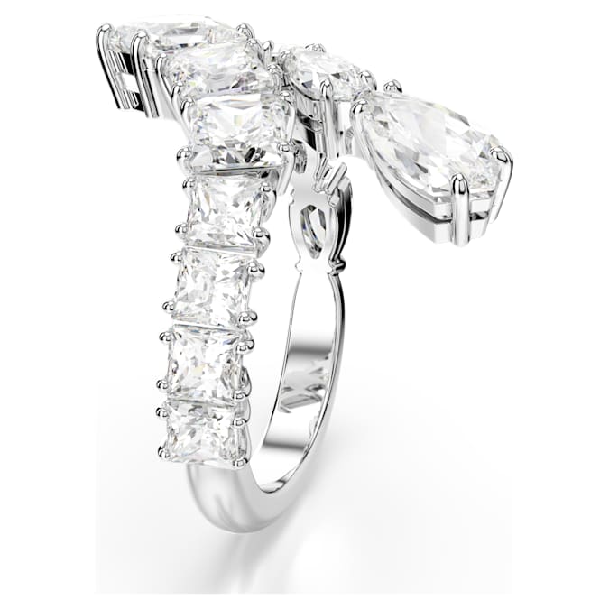 Sophistication shines brightly in this exquisite Matrix ring. The rhodium plated design is adorned with an array of clear Swarovski Zirconia in pear and square cuts, featuring a gradient of sizes for an unexpected silhouette. Wear it alongside a matching Matrix cuff and enhance your inner light.