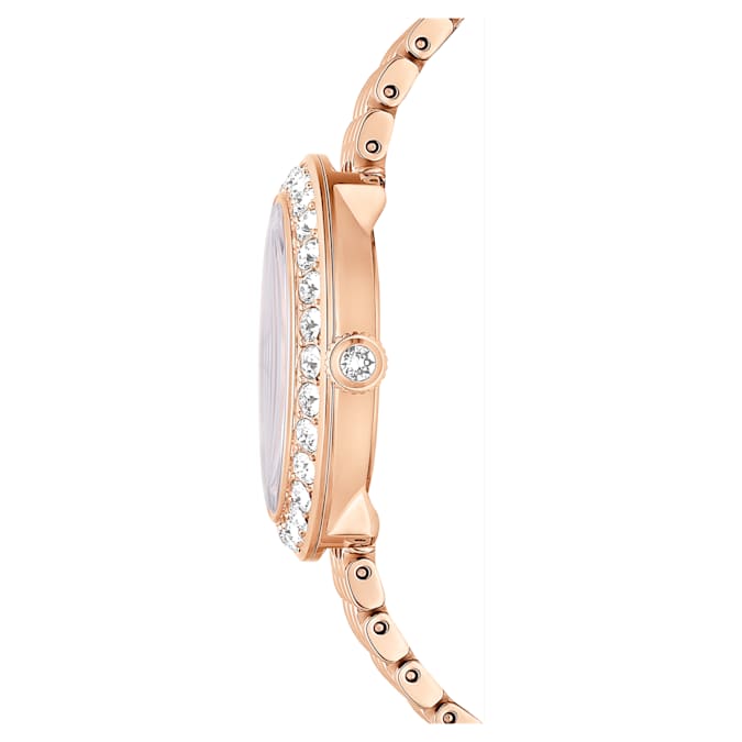 This Matrix watch seamlessly blends contemporary styling with Swarovski’s signature savoir-faire. The round 30mm case is made with a beautiful rose gold-tone finish and features a bezel set with a pavé of 30 crystals. Beneath the mineral glass, a mesmerizing guilloché dial is revealed, with the Swarovski swan logo at 12 o’clock, along with indexes created from round and baguette crystals. There is also a single crystal set in the watch’s crown. For style around the wrist, the watch is presented on a seven-link bracelet with a rose gold-tone finish. This Swiss made watch is water resistant to 50m and is designed to keep you on time for everyday occasions with exquisite sophistication.