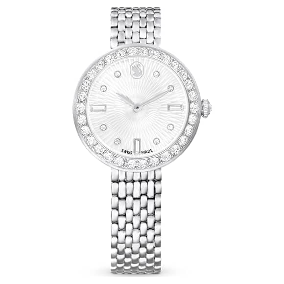 This Matrix watch is creatively crafted to accentuate any outfit. The round 30mm case is made in stainless steel and features a bezel set with a pavé of 30 crystals. Beneath the mineral glass, a mesmerizing guilloché dial is revealed, with the Swarovski swan logo at 12 o’clock, along with indexes created from round and baguette crystals. There is also a single crystal set in the watch’s crown. For style around the wrist, the watch is presented on a seven-link bracelet in stainless steel. This Swiss made watch is water resistant to 50m and is designed to keep you on time for everyday occasions with exquisite sophistication.