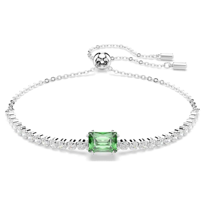 Adding a touch of radiance to any look, this classic tennis bracelet combines clear Swarovski Zirconia with a pop of color. Fastened with a sliding closure, the rhodium plated jewelry features a uniform row of clear Swarovski Zirconia and is accented with a baguette-cut green Swarovski Zirconia at its center. A vibrant twist on a timeless style.