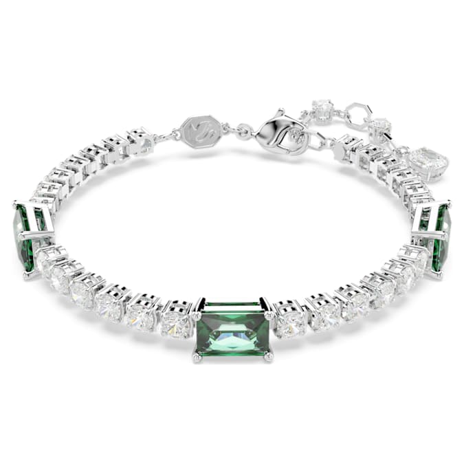 This radiant Matrix tennis bracelet is designed to thrill from every angle. An all-around design of clear round stones is interjected by rectangular stones in deep green, illuminated by a rhodium plated setting. For added detail, the elongation is embellished with a scattering of dazzling stones. Elevate every celebration with this elegant piece that you’ll reach for again and again.