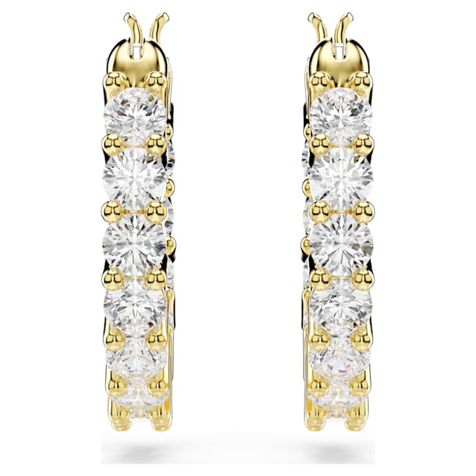 These pierced mini hoops by Swarovski are a radiant and timeless piece of jewelry. Both earrings are gold-tone plated and decorated with numerous Swarovski Zirconia that enhance their attractive look with subtle shimmer. Best worn with matching necklaces and bracelets, these earrings are a delightful gift for everyday wear.