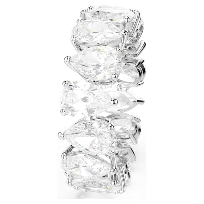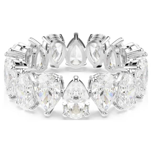 This ring by Swarovski showcases the sparkling beauty of gleaming, faceted stones. White, drop-shaped elements arrayed in a single row beautifully reflect and refract incoming light. Its puristic, elegant forms make this ring perfect for combination with other pieces of jewelry and trendy stacking looks with matching rings. An excellent choice to enhance an outfit for special occasions, and a truly inspired gift giving idea.