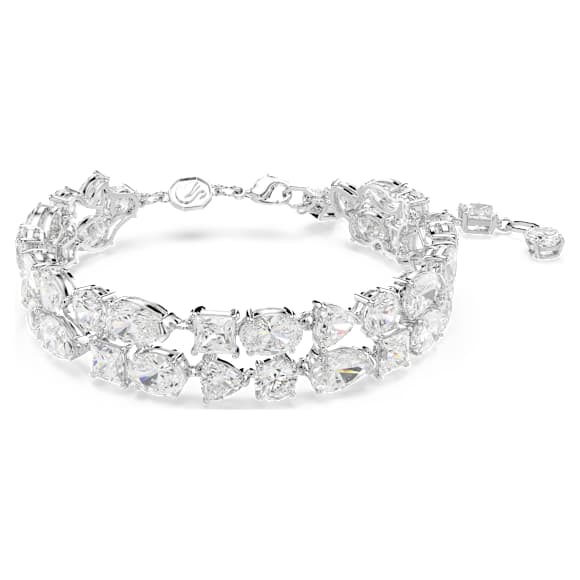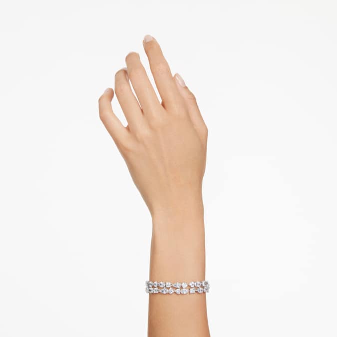 Make this extraordinary double-row bracelet one of the defining pieces of your jewelry collection. The rhodium plated design combines a radiant cluster of prong-set Swarovski Zirconia in a dramatic mix of cuts finished with a lobster closure. For added luxury, the hanging elongation features a string of Swarovski Zirconia. Pure elegance for your own evening style, or a wondrous gift for a loved one.