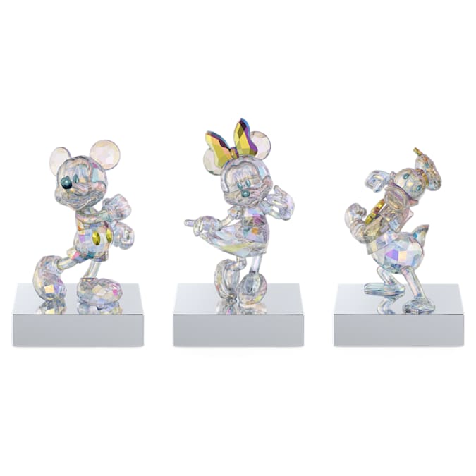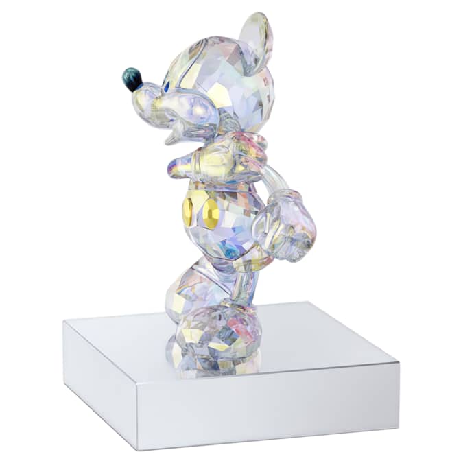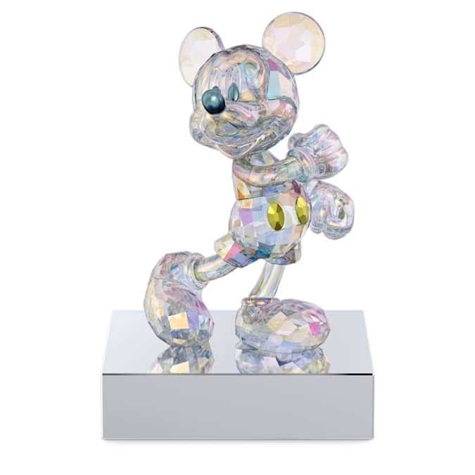 This luminous Mickey Mouse-inspired figurine is a mesmerizing example of Swarovski savoir-faire. Showing Mickey in a dynamic pose cut with 530 facets, it has a reflective platinum sheen created with an all-over coating of our signature Aurora Borealis effect for increased shimmer and intensity. Featuring a metallic base with a chrome finish and black velvet bottom, the figurine can also be removed from the base and placed anywhere in your home. A playful piece that beautifully celebrates one of the world’s most beloved animated characters. Decoration object. Not a toy. Not suitable for children under 15.
