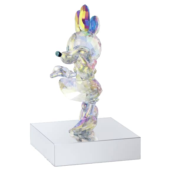 This luminous Minnie Mouse-inspired figurine is a mesmerizing example of Swarovski savoir-faire. Showing Minnie in a dynamic pose cut with 638 facets, it has a reflective platinum sheen created with an all-over coating of our signature Aurora Borealis effect for increased shimmer and intensity. Featuring a metallic base with a chrome finish and black velvet bottom, the figurine can also be removed from the base and placed anywhere in your home. A playful piece that beautifully celebrates one of the world’s most beloved animated characters. Decoration object. Not a toy. Not suitable for children under 15.