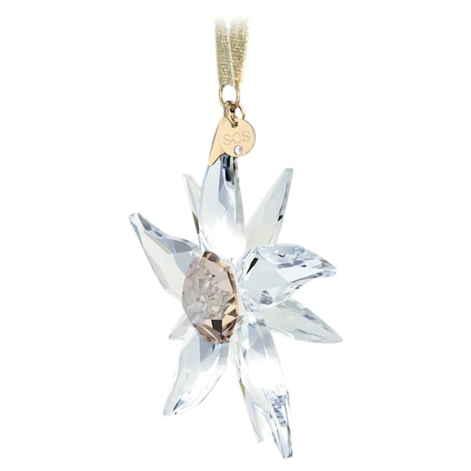 Created exclusively for SCS members, this delicate edelweiss motif is a tribute to Swarovski’s origins when the prettiest of alpine flowers was the company’s logo. A beautiful example of Swarovski’s savoir-faire, the piece is expertly cut from 239 facets and features elegant silver and golden shades. The flower is suspended on a golden lamé ribbon with a gold-tone plated tag engraved with “SCS” and embellished with a single chaton. A radiant piece that will bring joyful nature into your home. Decoration object. Not a toy. Not suitable for children under 15.