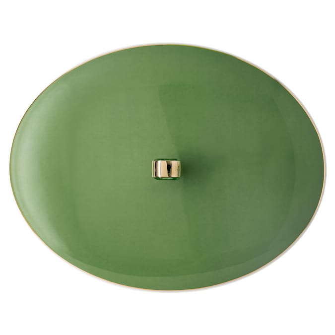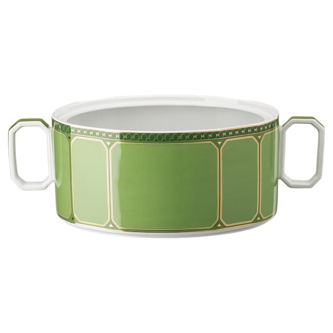 Create theatre at the table with this vibrant green serving bowl, designed in collaboration with porcelain brand Rosenthal. Featuring artful octagonal handles and a swan-engraved octagon-cut crystal on the lid, this is a special centerpiece for coming together and making memories. The bowl is dishwasher safe, however the lid should be hand cleaned. Usage in the microwave is not recommended.