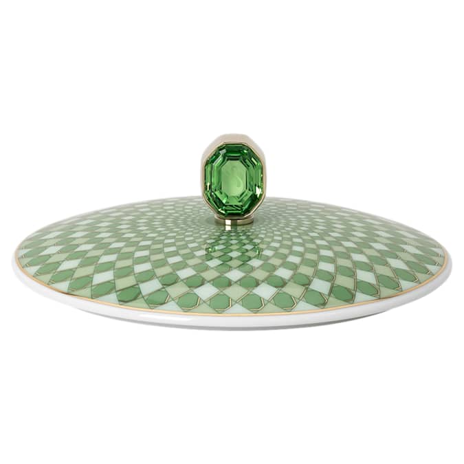 This low-level porcelain box is ideal for storing precious treasures or small kitchen items. A green geometric print, inspired by Swarovski’s signature octagon and the Wiener Werkstätte art scene, adorns both sides and the lid, while an octagon-cut green crystal on the lid completes the design. This box was created in partnership with porcelain brand Rosenthal. Do not use in the dishwasher or microwave.
