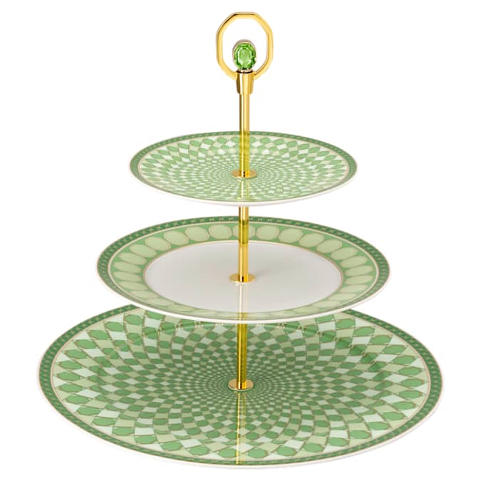 The perfect blend of sweetness and sophistication, this three-tier étagère will bring elegance to any table. Crafted from porcelain, each level of this spectacular cake stand features a green geometric pattern inspired by Swarovski’s signature octagon. The octagon also appears on the gold-tone handle, alongside a single green crystal. This étagère was created in partnership with porcelain brand Rosenthal. Do not use in the dishwasher or microwave.