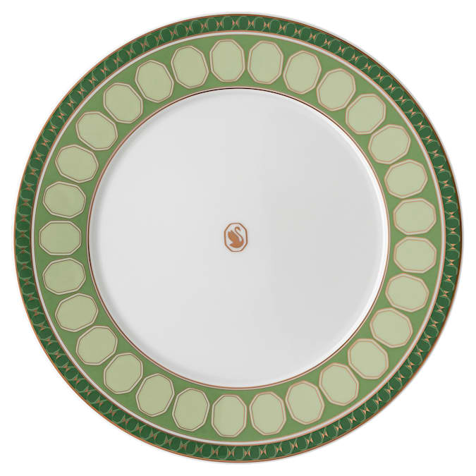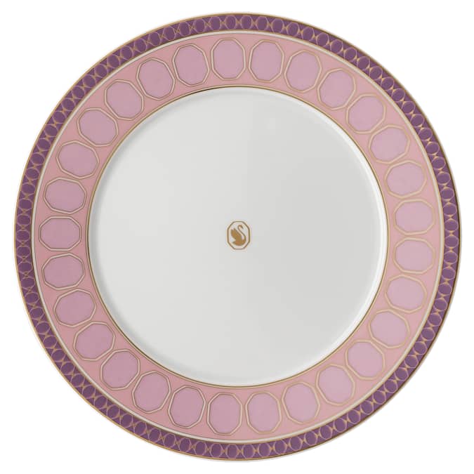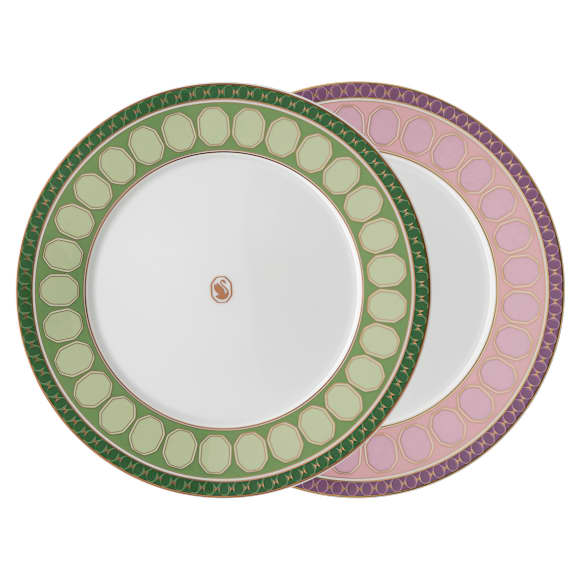 Create a feast of wonder with this pink and green plate set. Inspired by the Wiener Werkstätte art scene, the mesmerizing geometric motif features Swarovski’s signature octagon with the iconic swan logo at the center in gold tone. Set the table with other colorful pieces from the Signum collection for maximum impact. This plate set is part of an exclusive collaboration with porcelain brand Rosenthal. It is dishwasher safe, however usage in the microwave is not recommended.