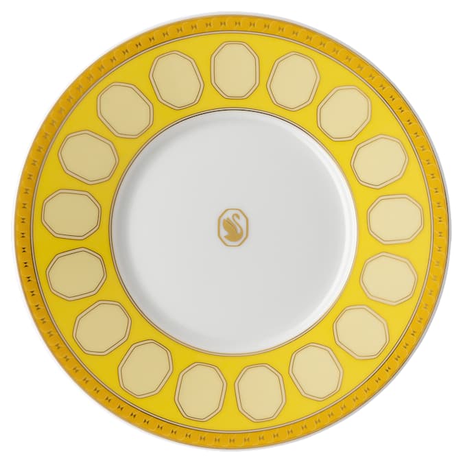 Bring playful sophistication to teatime with this elegant yellow cup and saucer set from the Signum family. The bright geometric motif features Swarovski’s signature octagon, complemented by an artful octagonal handle and our iconic swan logo in golden tone. Style yours with the matching teapot in the same color. This teacup set is part of a collaboration with porcelain brand Rosenthal. It is dishwasher safe.
