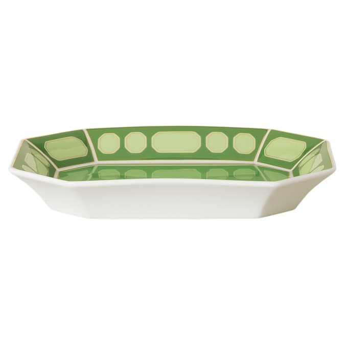 Elevate your tablescape with this large Signum tray. Crafted from porcelain, the tray reflects Swarovski’s signature octagon shape with a matching geometric pattern in green. It’s a sensational way to bring color and elegance to any occasion. This tray was created in partnership with porcelain brand Rosenthal. Do not use in the dishwasher or microwave.