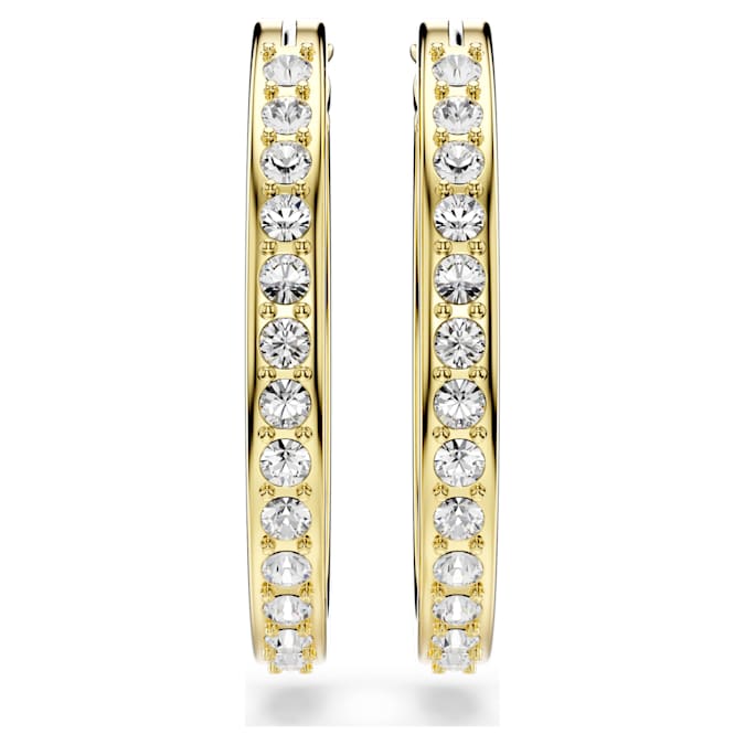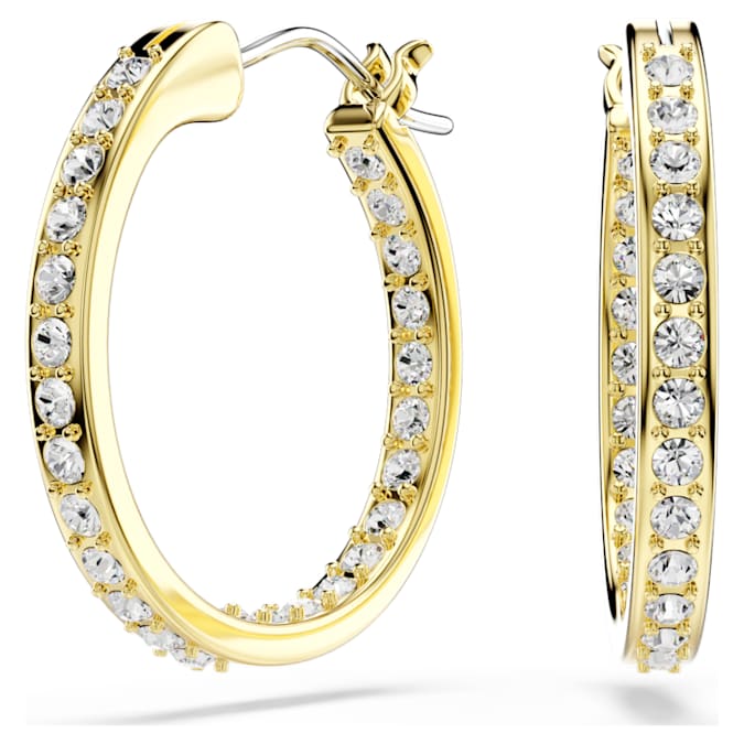 Elevate your hoop earring style with this small Swarovski pair. The outer edge of each gold-tone plated earring is delicately embellished with clear crystal pavé, lending a soft glow to a timeless design. A classic pair of earrings, which is easy to wear on any occasion.
