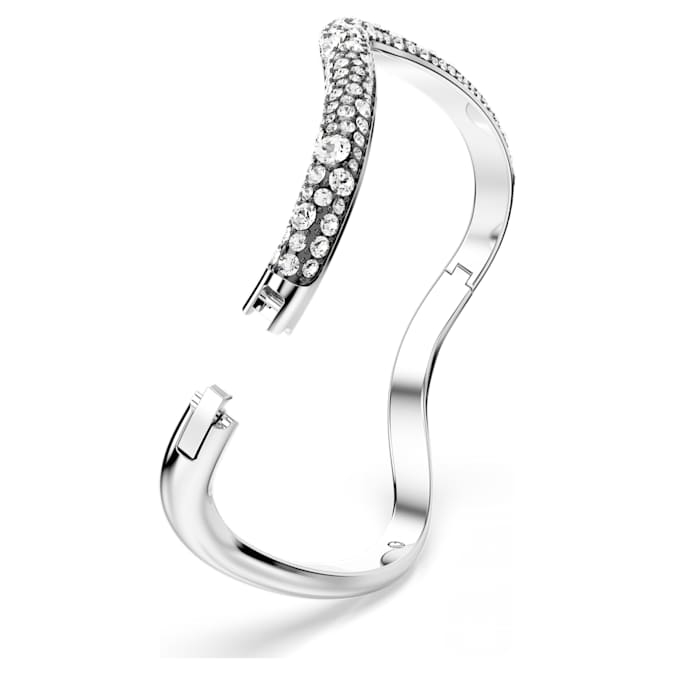 Echoing the undulating ocean waves, this Sublima bangle embodies dynamic elegance. Its flowing shape is adorned with a pavé of clear crystals set in a ruthenium plated base, with rhodium plating behind. The Meteora pattern of differently sized crystals provides a unique and dazzling effect. A fitting tribute to the marine landscape that will infuse any look with tranquility.
