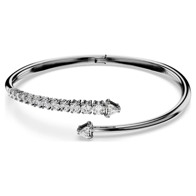 Let your alternative side shine with this impactful Sublima bangle. The ruthenium plated band is open-ended and spirals around the wrist with a variety of clear Swarovski Zirconia in prong settings. The spiky tips add a contemporary finish and match perfectly with other jewelry pieces from the same expressive family.