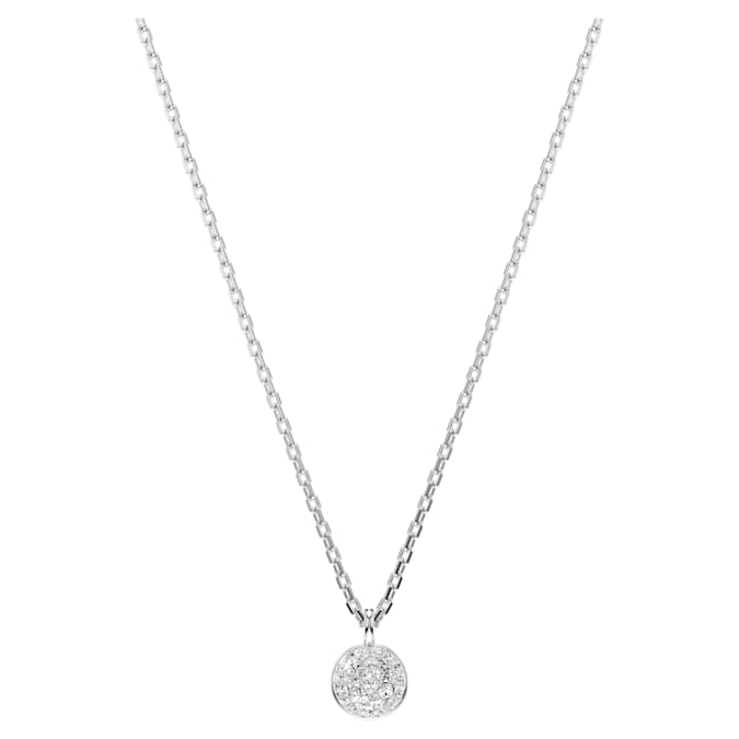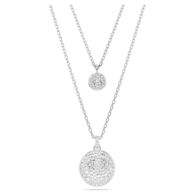This shimmering layered pendant is the ideal way to fill your style with light. The rhodium-plated design features two chains, each with a domed meteor motif that is beautifully adorned with a snow pavé of clear round crystals in different sizes. For extra versatility, the pendant can be reversed, revealing a halo of crystals around the larger motif, and a single crystal at the center of the smaller motif. A wondrous gift for yourself or a loved one.