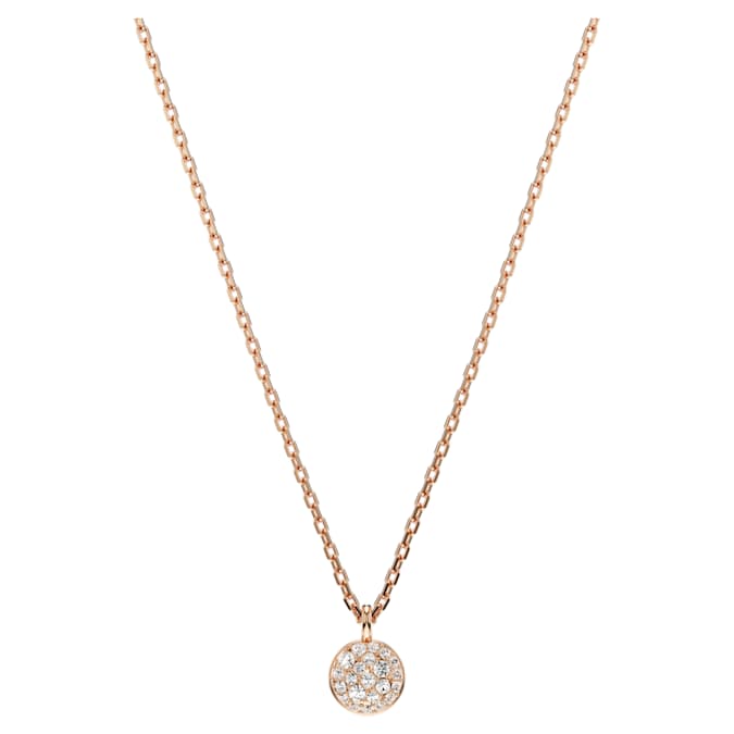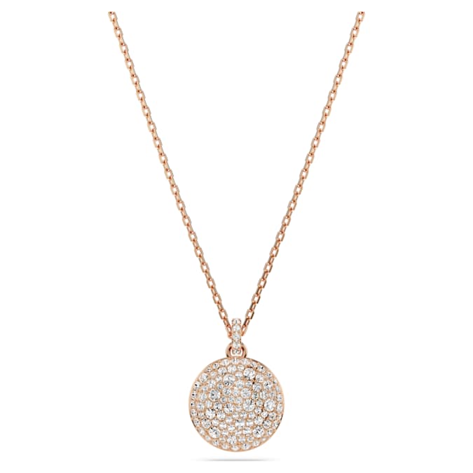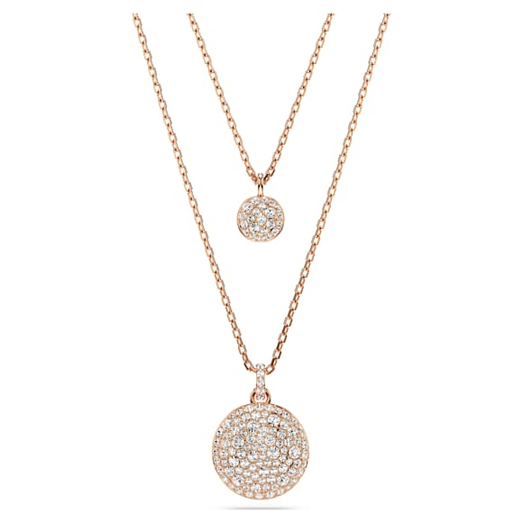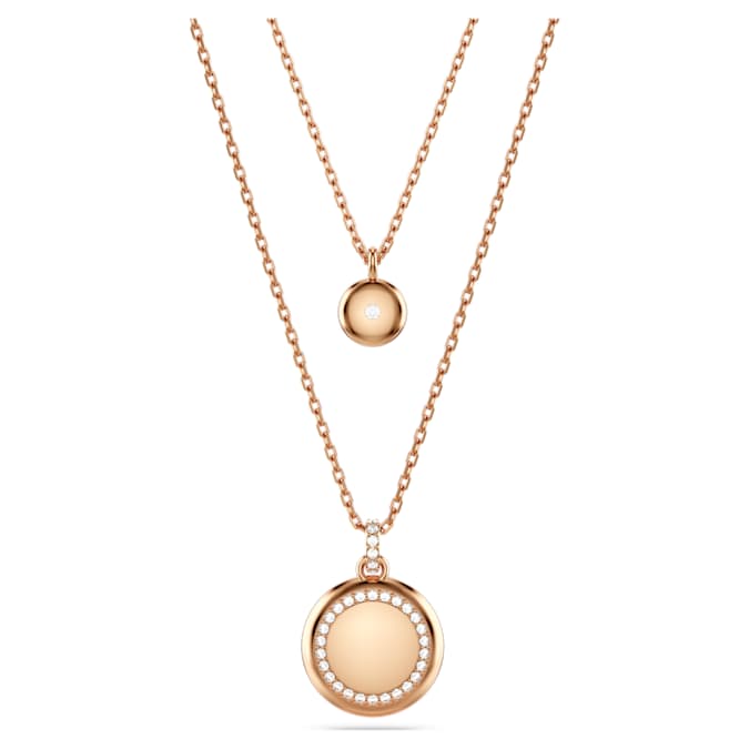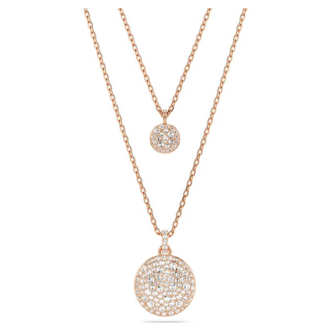 This shimmering layered pendant is the ideal way to fill your style with light. The rose gold-tone plated design features two chains, each with a domed meteor motif that is beautifully adorned with a snow pavé of clear round crystals in different sizes. For extra versatility, the pendant can be reversed, revealing a halo of crystals around the larger motif, and a single crystal at the center of the smaller motif. A wondrous gift for yourself or a loved one.