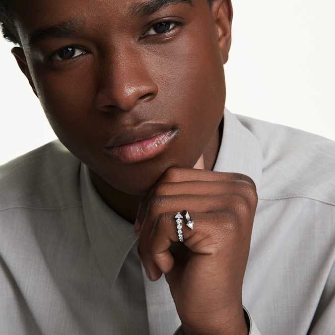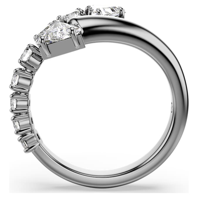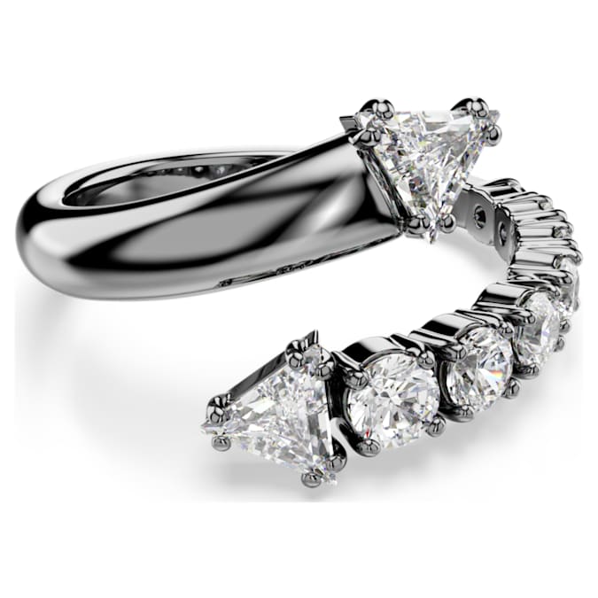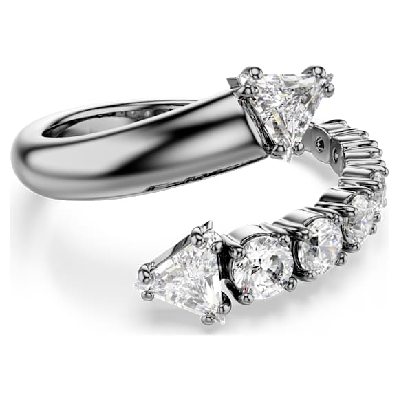 This Sublima ring offers an impactful alternative to everyday styling. The ruthenium plated band is open-ended and spirals around the finger with a variety of clear Swarovski Zirconia in prong settings. The spiky tips add a contemporary finish and match perfectly with other jewelry pieces from the same expressive family.