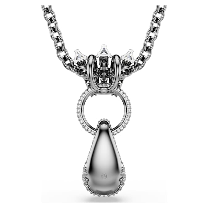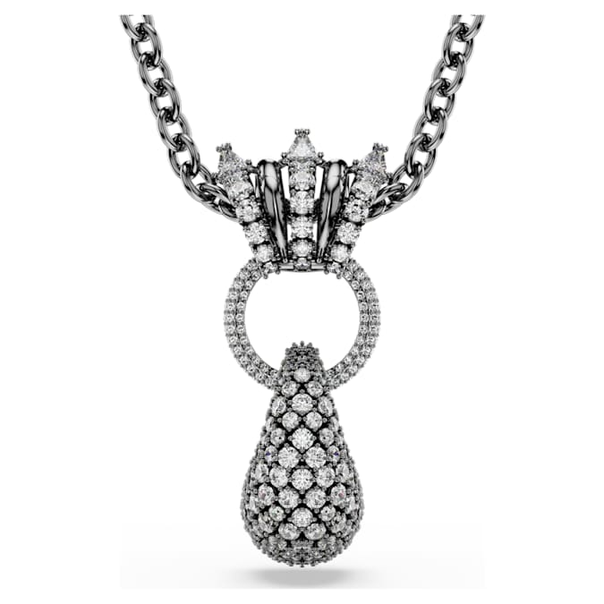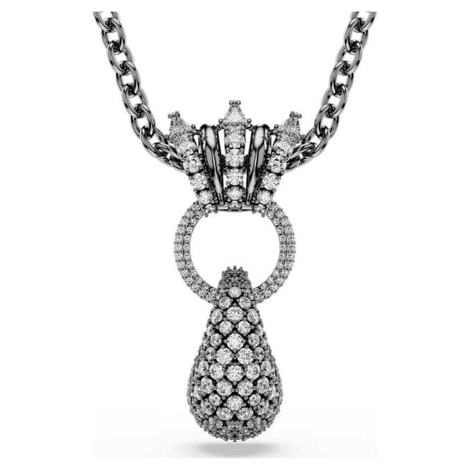 This scintillating pendant is designed with three unique elements, revealing expressivity in every detail. Worn on a long chain, the ruthenium plated design includes metallic spirals with round and spiky Swarovski Zirconia, a central hoop, and a large droplet at the center that showcases the chatonnage technique. It’s a bold way to style yourself for everyday occasions.