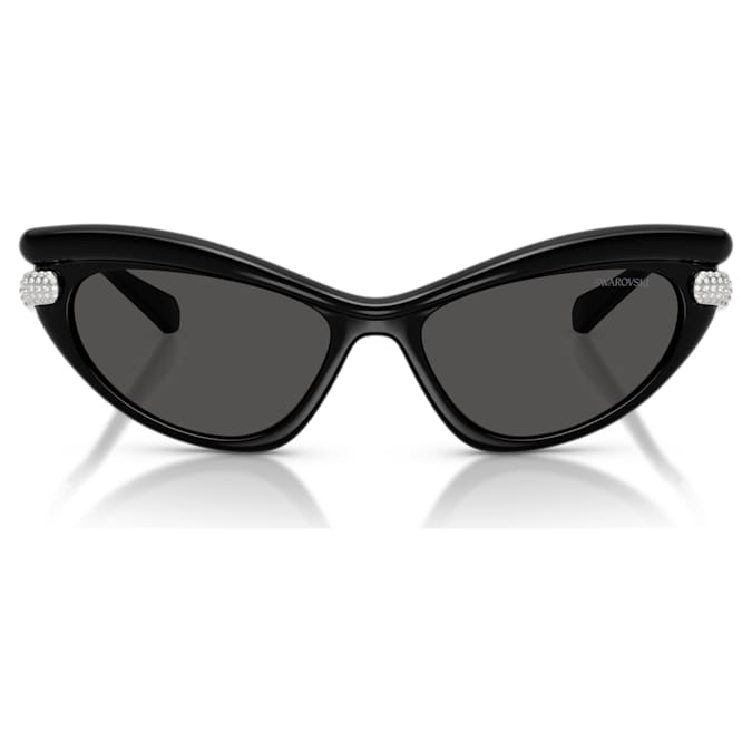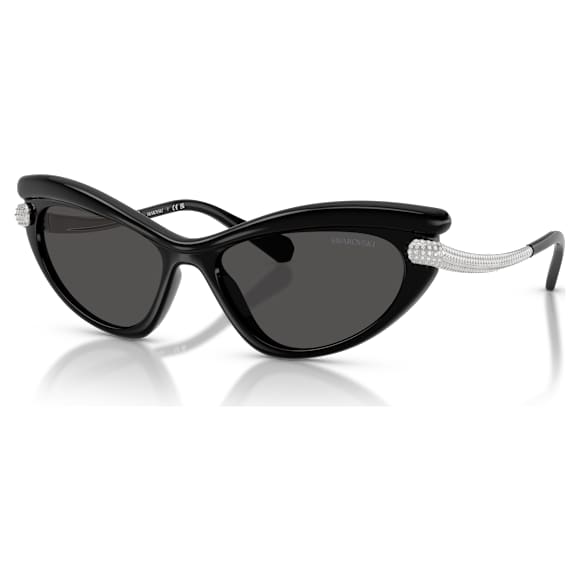 Futuristic and edgy, these statement sunglasses are inspired by the Sublima jewelry family. The expressive silhouette is defined by shiny black frames in a cat-eye shape, and metal temples that are enriched with radiant pavé. The dark grey lenses complete the modern look, giving you a shimmering way to accessorize with Swarovski savoir-faire.