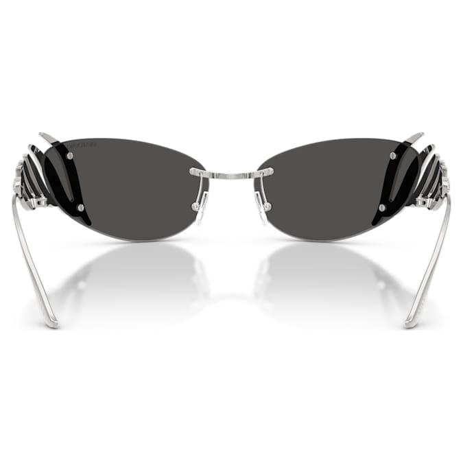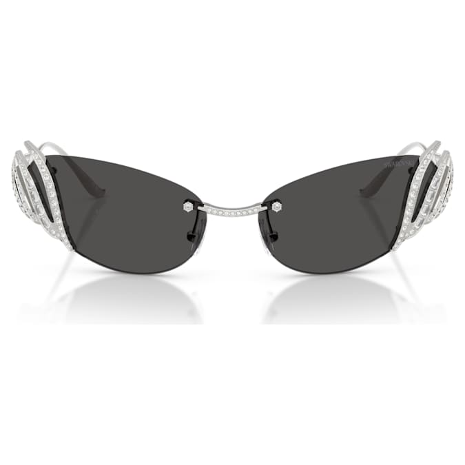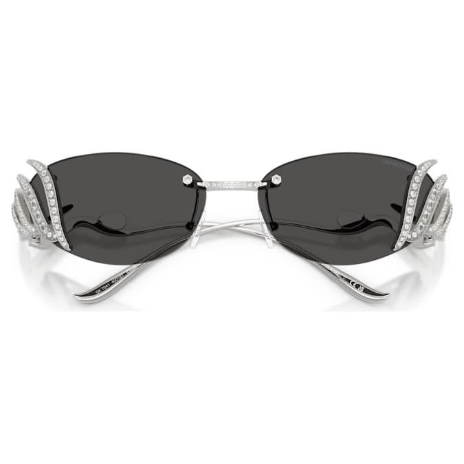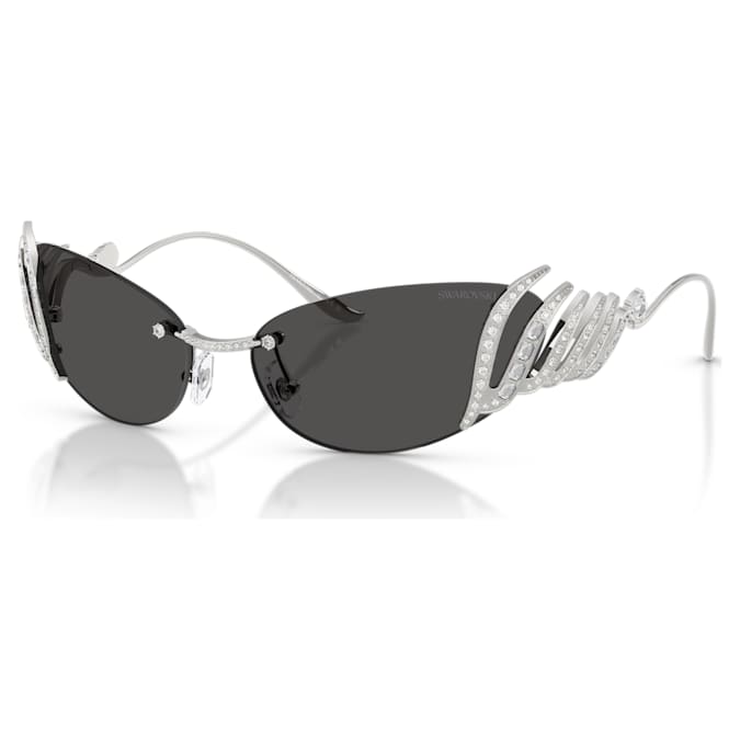 These sophisticated sunglasses are inspired by the Swan Vienna jewelry family, which reinterprets the graceful qualities of Swarovski’s iconic swan emblem. The metallic frames are crafted with feather-like strands on each temple, adorned in clear crystals of varying cuts and sizes. The rimless style is further enhanced by dark gray lenses in a classic cat-eye shape. Pair these sunglasses with the matching jewelry pieces to make an all-over statement of refinement and elegance.