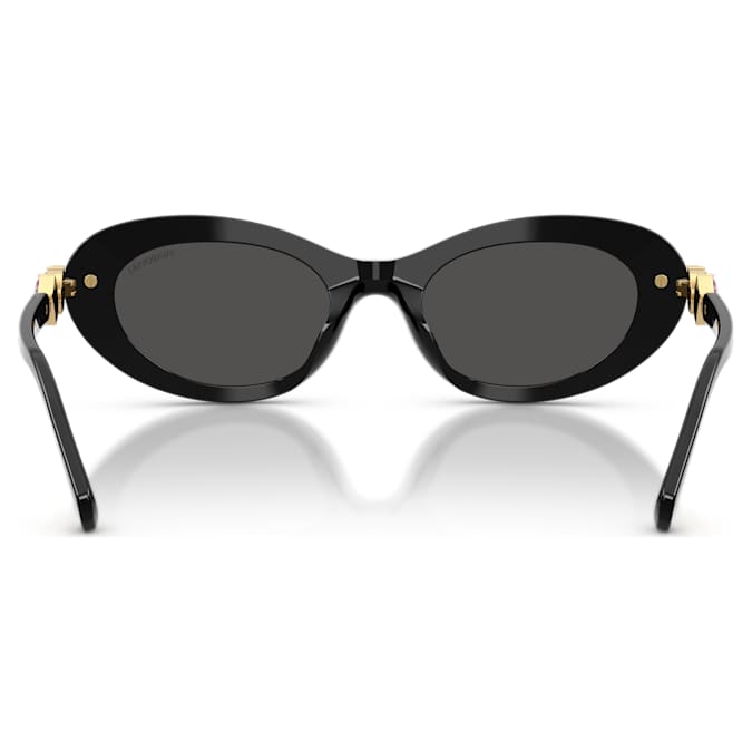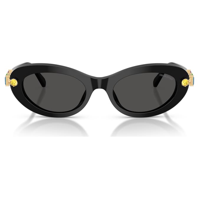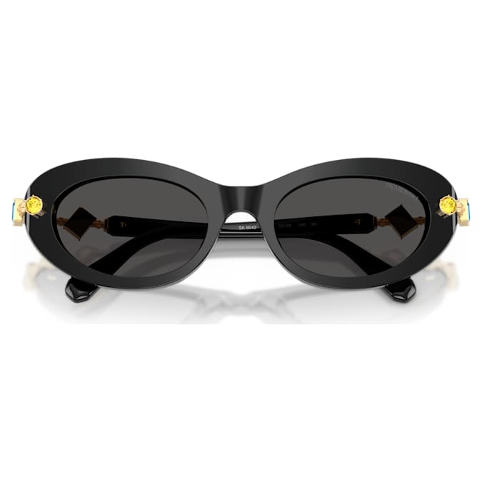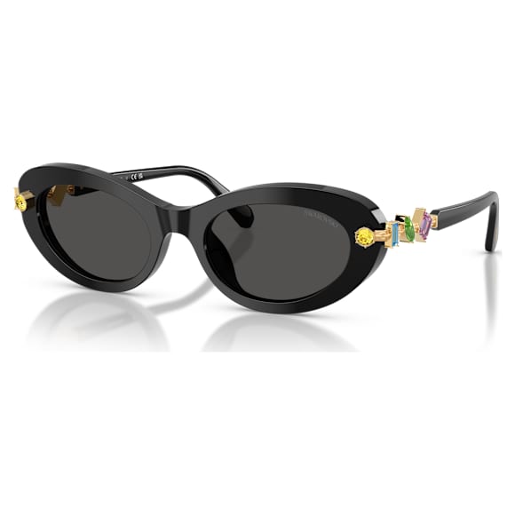 Combining classic black frames with multicolored crystals, these Gema-inspired sunglasses offer the perfect balance between subtle and vibrant. The oval-shaped design is crafted with dark gray lenses and features three crystals on each temple – all revealed in different shapes and candy colors. Match this pair of sunglasses with Swarovski’s Gema jewelry pieces to coordinate your look.