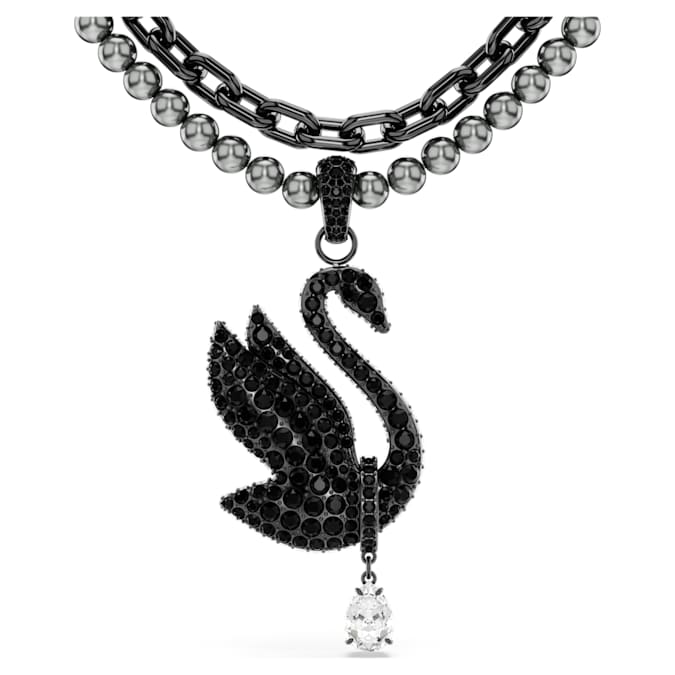 This sensational choker is a statement piece that offers elegance and edge. The ruthenium-plated jewelry is worn on a bold chain with an additional string of gray Crystal Pearls. At the center, there is a gorgeous swan motif made from a pavé of black crystals, which can be removed and worn as a brooch. For an extra flourish, a clear pear-shaped crystal delicately hangs beneath. Wear this choker as an evening adornment to embrace all the noble qualities of the swan.