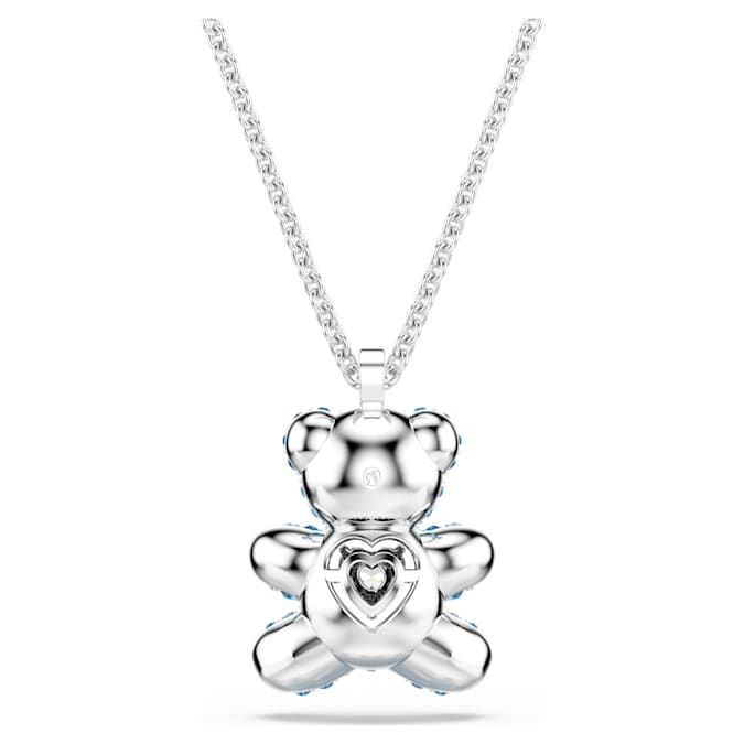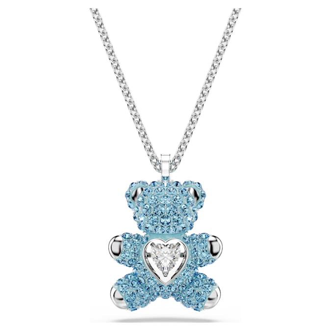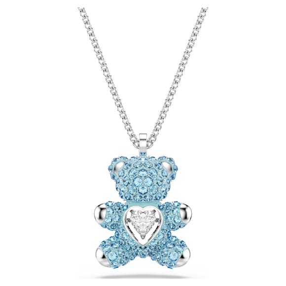 Inspire a smile with this playful pendant. The 3D teddy is covered in blue crystal Pointiage® and holds a heart-shaped dancing stone in a clear tone. Finished with a rhodium plated chain, this unique design encapsulates happiness and love.