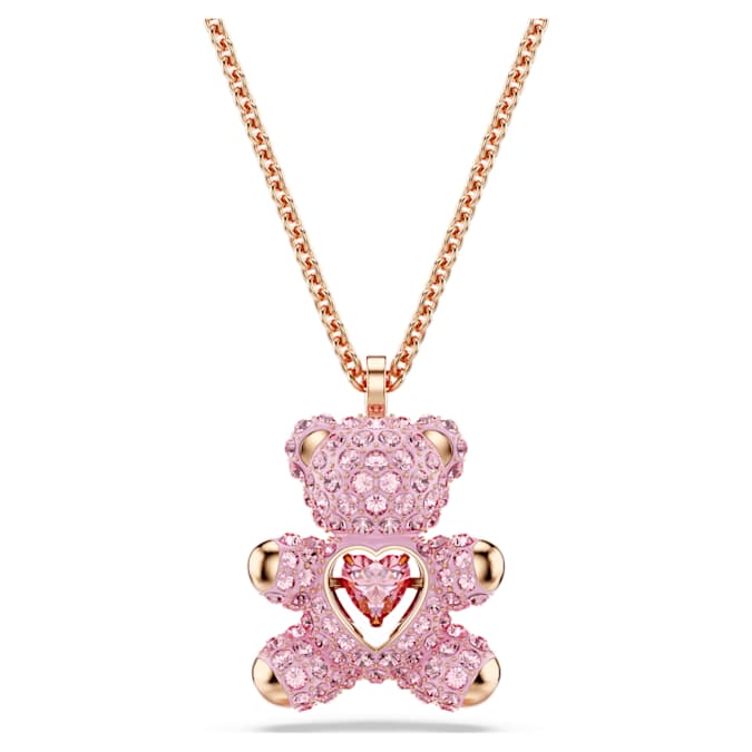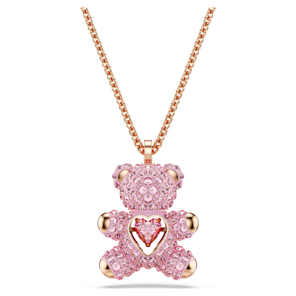 Inspire a smile with this playful pendant. The 3D teddy is covered in light pink crystal Pointiage® and holds a heart-shaped ‘dancing’ stone in a vibrant pink shade. Finished with a rose gold-tone plated chain, this unique design encapsulates luck and love.