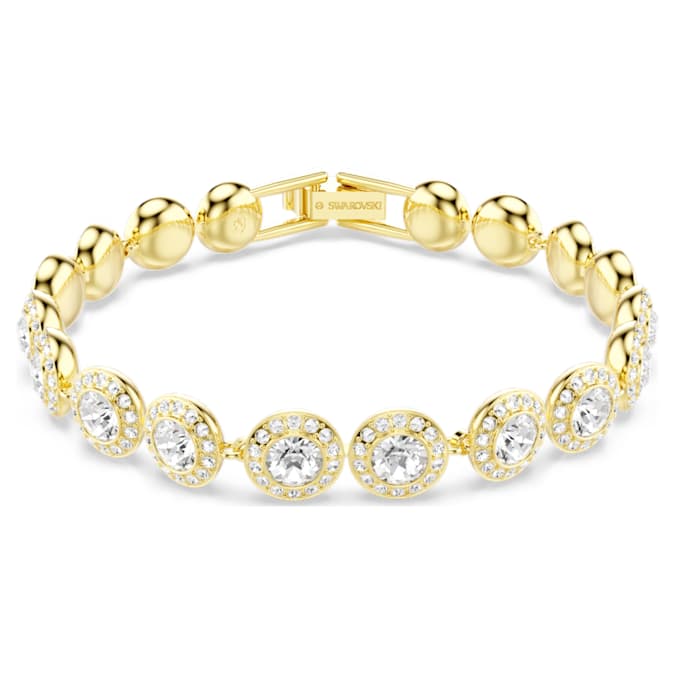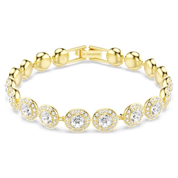 Pure, timeless sophistication. This gold-tone plated Una Angelic bracelet features a row of round clear crystals, each one framed in sparkling clear crystal pavé. Combining perfectly with other pieces from the Una Angelic family, it would make a gorgeous gift.