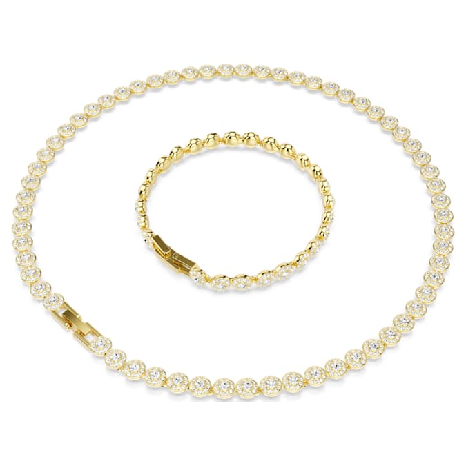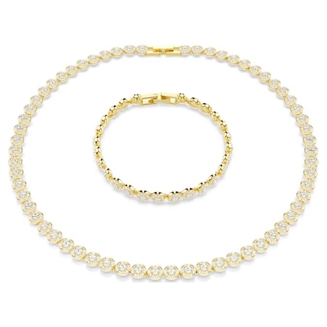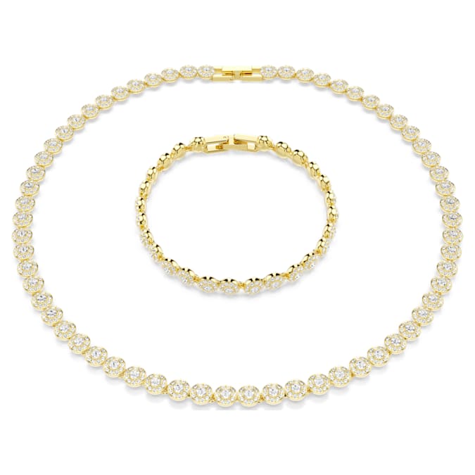 Harmonizing luxury throughout your style, this gold-tone plated set was born to shine. Each piece features a full surround of round-cut crystals, each framed by a halo of clear pavé. This includes the dainty motifs on both the necklace and the bracelet. The foldover clasps deliver a seamless closure, while the additional extenders mean you can adjust the jewelry for both comfort and size. Wear these pieces together whenever you need a look of all-over glamour.