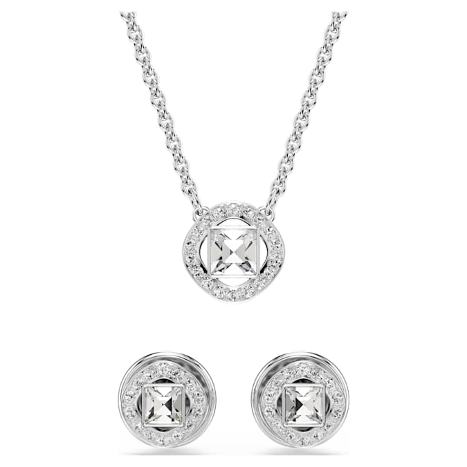 This timeless pendant and earrings set will make a beautiful gift for someone special. Each piece is crafted with square-cut crystals framed with clear pavé and finished with sleek rhodium plating. They can be styled together or worn separately – anything goes.