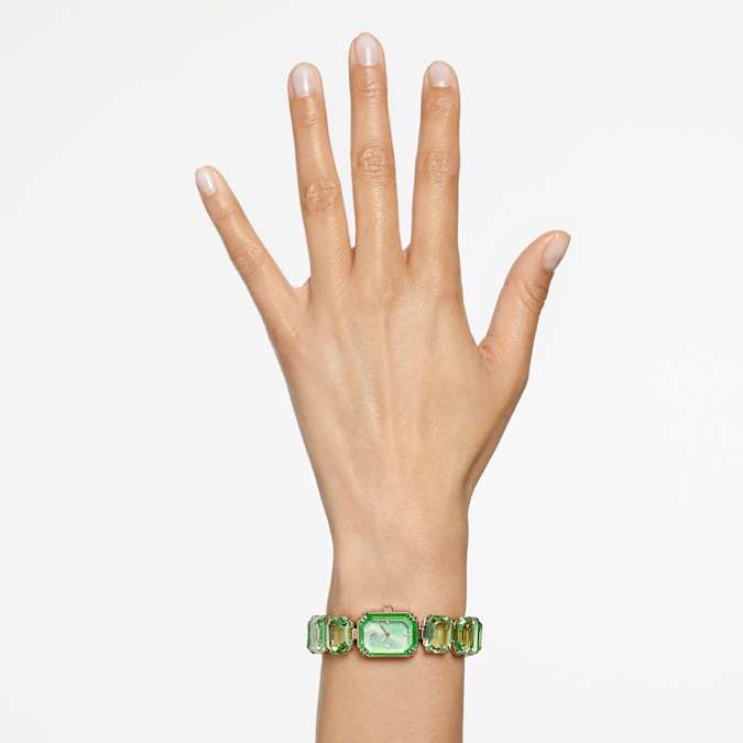 Inspired by the Millenia family, this eye-catching bracelet watch delivers color pop appeal. Expertly crafted from a row of octagon-cut crystals in a vibrant green hue, it features a green dial, a crystallized bezel, and a champagne gold-tone finish. It is water resistant to 50m and makes a bold choice for solo styling or layering.