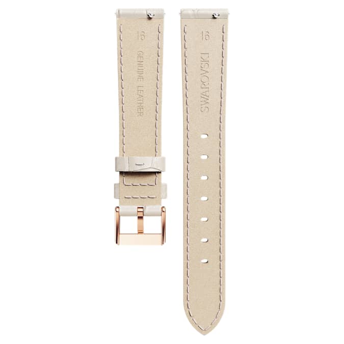 This Italian calf-skin gray leather strap by Swarovski adds glamorous style to your watch. The crocodile-embossed strap features a stainless steel buckle with a rose gold-tone finish and a quick-release spring bar allowing for an easy fit to your Swarovski watch. It is 16 mm wide and 16 cm long, and is compatible with watches including Matrix Chronograph, Crystalline Glam, Octea Chrono, Octea Nova, Crystalline Wonder, Octea Moon, and Matrix Tennis Chrono.